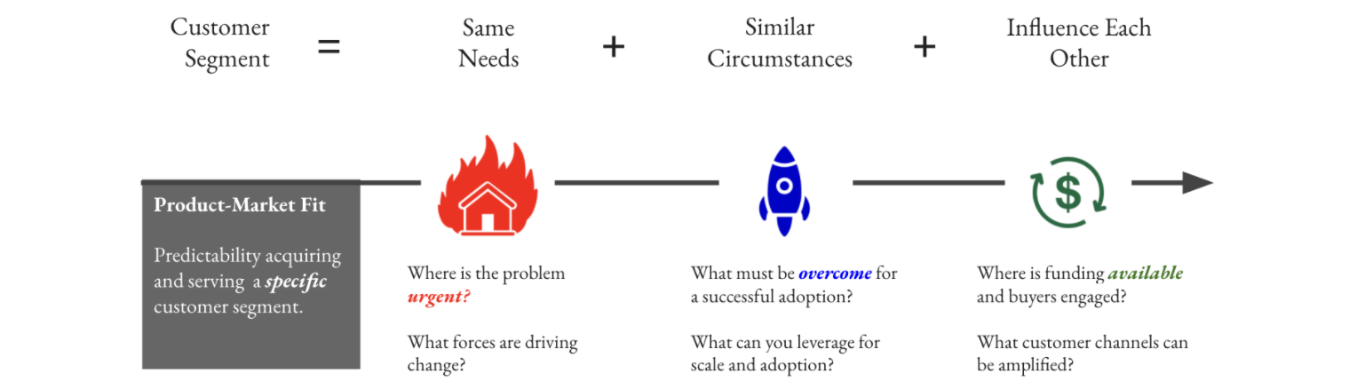 To reach product-market fit, identify and concentrate on customer segments where the three aspects of a market need are true.