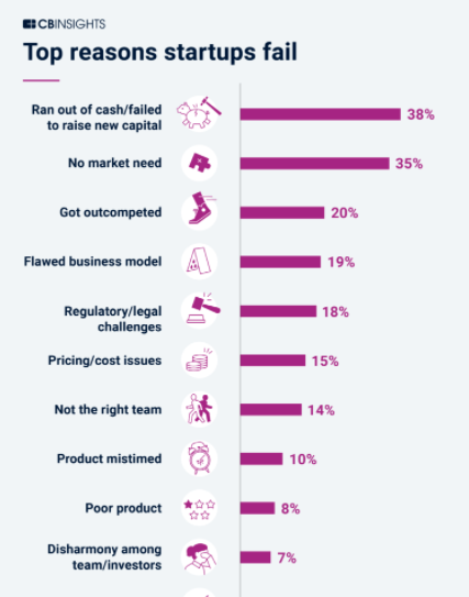 The top reasons why new products fail are the lack of a market need and running out of cash in pursuit of one.